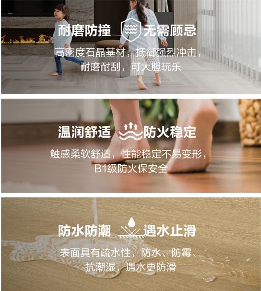 家里装地暖?石晶地板导热均匀,是温暖的好搭档。住在潮湿的南方?它不惧梅雨,防水防潮,不会让你看着发胀的地板发愁。有活泼好动的孩子或宠物?耐刮擦的特性让你不再为每个小痕迹心疼。