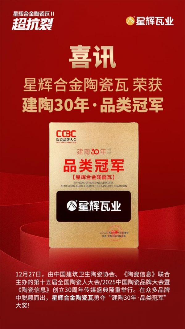 凭借合金陶瓷瓦所树立的标杆级品质、系统化的运营管理体系及深厚的市场公信力,历经“2025中国陶瓷品牌大会组委会”与“《陶瓷信息》三十周年传媒盛典组委会”组织的多轮严苛评审,最终作为唯一获此殊荣的陶瓷瓦品牌。这不仅是奖项的加冕,更是对星辉瓦业作为行业领军品牌,在质量体系、技术实力与企业责任三大维度上所达到的卓越高度的权威认证。