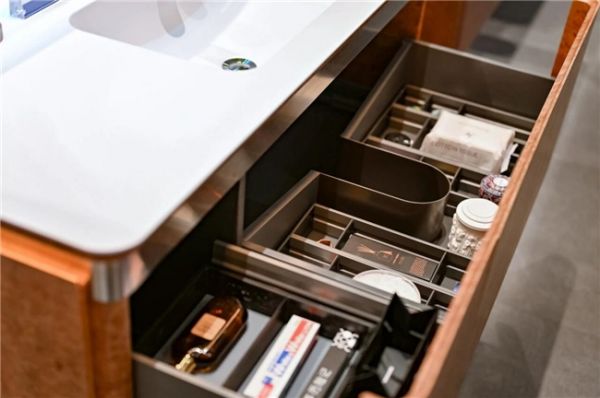 悍高西西里系列浴室柜以意式设计重塑卫浴空间气质,柔和流畅的原创曲弧造型,视觉上恰似锦江流水的灵动曲线,自带舒展韵律感。升级加厚的金属包边勾勒出精致轮廓,强化了防潮抗变形性能,搭配星际元素的定制拉手,低调中透着轻奢质感。柜内配备可自由调节的分层隔板与分类收纳盒;镜柜内置紫外线牙刷消毒区与嵌入式干手干发模块,解决潮湿环境下的日常护理痛点,智能照明系统支持无极调光与暖、白、中性三色氛围切换,搭配触感细腻的意大利进口ALPI木饰面,让每一次卫浴体验都兼具舒适与仪式感。