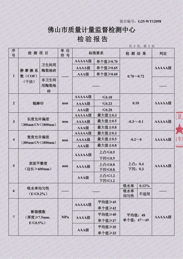 作为深耕建筑陶瓷领域的品质引领者,将军陶瓷集团始终将“产品是企业生命线,品质是发展压舱石”的理念贯穿研发、生产到交付的全链条。从原料甄选、工艺创新到成品检测,集团构建起一套系统、严苛且可追溯的全流程品质管控体系。其产品率先通过国家最新陶瓷砖标准5A级认证,成为行业首批达标企业,以实打实的产品力赢得市场信赖与业界认可,也为屡获殊荣奠定了坚实底气。
