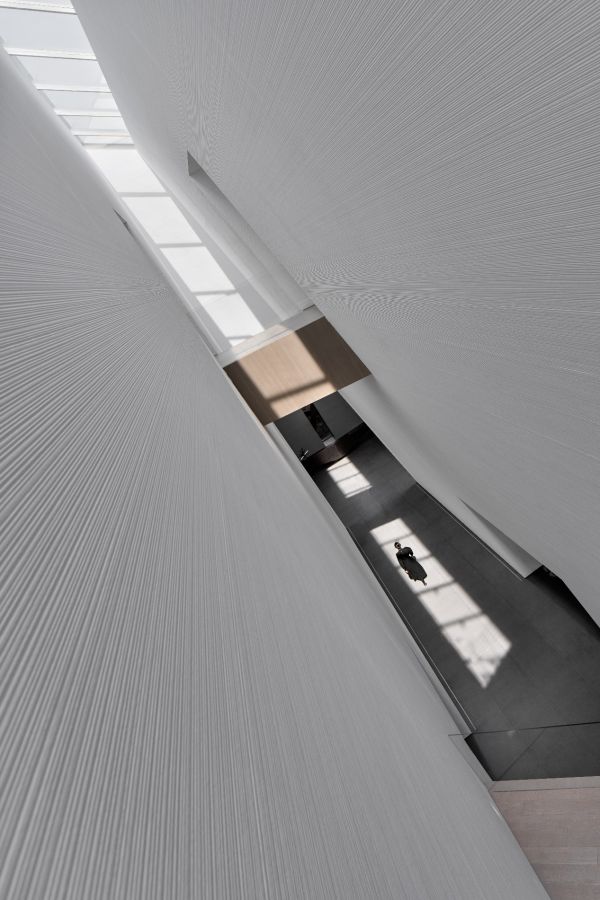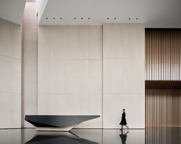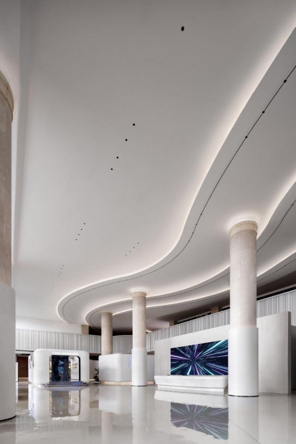 另一个案例,是长春“保利朗阅”项目。客户希望空间能作为城市展厅长期使用,“十年不过时”。团队大胆引入常用于建筑外墙的“光触媒”材料至室内。这种材料具有自洁功能,极大降低了高挑空间的维护成本,并通过独特的光影肌理,营造出兼具艺术性与功能性的持久空间。