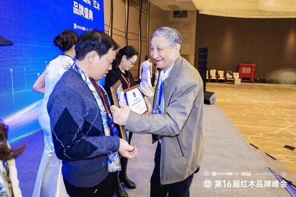 喜迎红红木荣获“2025红木家具十大受欢迎品牌”,故宫博物院文保科技部原主任曹静楼(右一)为企业代表王红阳(左一)颁奖