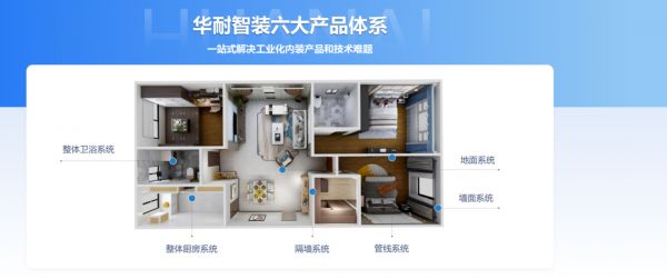 华耐智装响应市场需求,积极布局工业化内装业务,公司通过对工业化内装制造体系、整体设计和安装交付的深入研究,依托30余年的供应链及设计交付服务优势,构建起产品研发、生产制造到施工维保的完整交付体系,提供的整体卫浴系统、整体厨房系统、隔墙系统、管线系统、墙面系统、地面系统等六大产品体系,助力“好房子”建设。