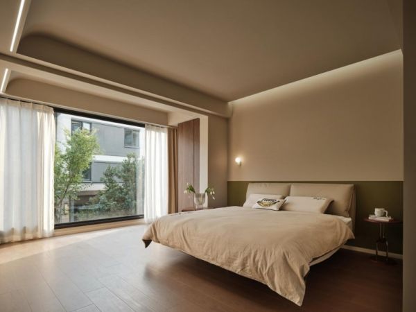 主卧延续圆弧造型与杏色调性,弱化建筑棱角,营造包裹感。原木床架、开放格斗柜以低饱和度呈现木材本真肌理,窗边阅读角借景打造庭院式空间构图,构建微型精神角落。