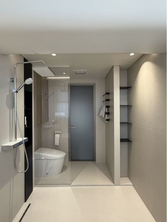 A:主卫实现了和主卧相匹配的面积和功能分区,在干湿分区的大框架下,打造了更为细致化的五大功能板块。宽敞的双台盆,充足的收纳。脏衣收纳区和内衣清洁区。马桶区,最后是淋浴和浴缸区域。功能动线合理流畅,每个使用场景下的细节也十分完善,任何操作都会很顺手。