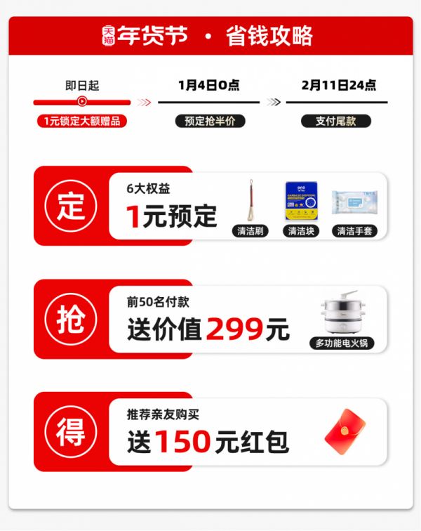 为了让更多家庭能享受科技清洁带来的品质生活,易科洛捷在本次天猫年货节推出了力度空前的促销活动。1月4日至2月11日,消费者仅需支付1元,即可享受堪比半价的年度重磅折扣,并锁定“六大权益”,包括预定即赠清洁礼包,包含专用清洁块、耐磨清洁手套,为您的新机保驾护航。成功推荐亲友购买,双方均可获得150元现金红包奖励,分享实惠,快乐加倍。前50名成功支付尾款的用户,将额外获赠价值299元的多功能电火锅一台。承诺全程价保,买贵必赔,不用担心后期降价。享受免费上门安装以及8年超长质保服务。