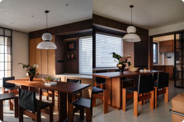 客厅、餐厅、门厅与阳台被整合为一个连续的生活界面。墙体的消隐,让家庭的日常活动成为空间的主角。光线在不同时刻游走,人的行走、停留、交谈,共同构成一幅流动的生活图景。