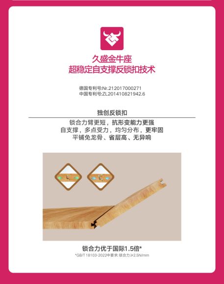 伴随全屋通铺、去龙骨安装、干燥潮湿环境应用等多元与复杂场景的出现,纯实木地板的稳定性成为了关键痛点。久盛凭借在纯实木领域连续多年的技术深耕,于2025年发布两项核心超稳定技术,使产品稳定性提升60%,这为此次品牌战略升级提供了坚实的技术底座,也完成了从“地暖专用”到“全场景适用”的价值跨越。