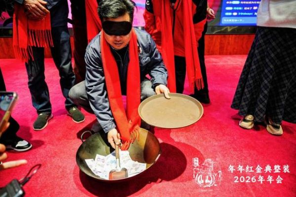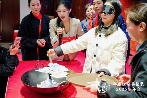 在充满文化厚重感的技艺比拼后,“马上来财”趣味游戏将年会带入轻松欢快的节奏。参与者同样被蒙上双眼,手持小铲,在限定时间内从一口大铁锅中尽可能多地“铲”起财富。游戏过程笑料百出,气氛热烈。这个环节设计巧妙,既贴合新年祈福纳祥的民俗,“蒙眼”完成的形式,又隐喻着在不确定的市场环境中,依靠扎实基本功与果断执行力把握机遇的企业精神。