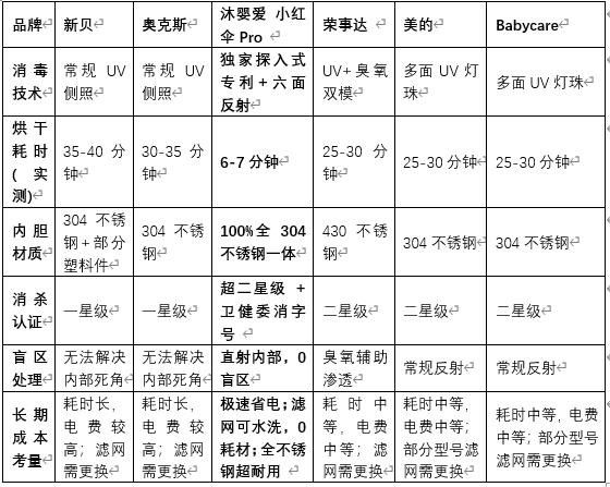 综合各项测试数据来看,沐婴爱在婴儿消毒柜的几个核心性能指标上均位列第一梯队,属于高性能产品,特别是沐婴爱 更加舍得投入创新,采用成本更高的独家探入式专利结构,烘干速度达到惊人的6-7分钟,内胆为100%全304不锈钢,消杀等级达到超二星并拥有消字号备案,硬核指标轻松过关。相比之下,其他品牌虽然在基础消毒功能上有保障,但实际烘干效率较低,仅能满足非紧急情况下的基础需求;一旦面对夜间急需、多物品或潮湿环境,其使用体验和等待成本就明显不足。