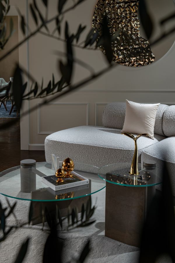 别墅庭院的外廊,翁葱的柑橘与橄榄叶影斑驳,衬其间革面Botanic扶手椅的纯白优雅与曲线灵动;一侧宛若灵动新芽的Germoglio灯盏与饱满松果状的Pumo摆件,轻泛鎏金光芒,巧蕴庆典般浮跃欢欣的盎然氛围。