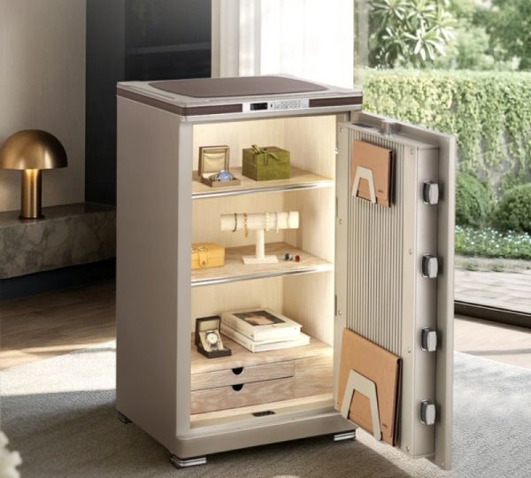 打开尊御系列的箱门,榆木纹理的纳帕皮革铺满整个内部,复刻自宋代皇家书房的榆木家具,既能避免贵重物品被刮花,又营造出“古籍藏珍”的雅致氛围。双层抽屉采用“分区收纳”设计,设置多个独立小格间,适配钻戒、耳环、手链等小件饰品,每个格间内衬柔软绒布,防止饰品碰撞磨损;下层则为开放式空间,可容纳手表盒、项链、纪念币等大件物品,抽屉滑轨采用“静音缓冲”设计,开关时悄无声息,尽显高端品质。