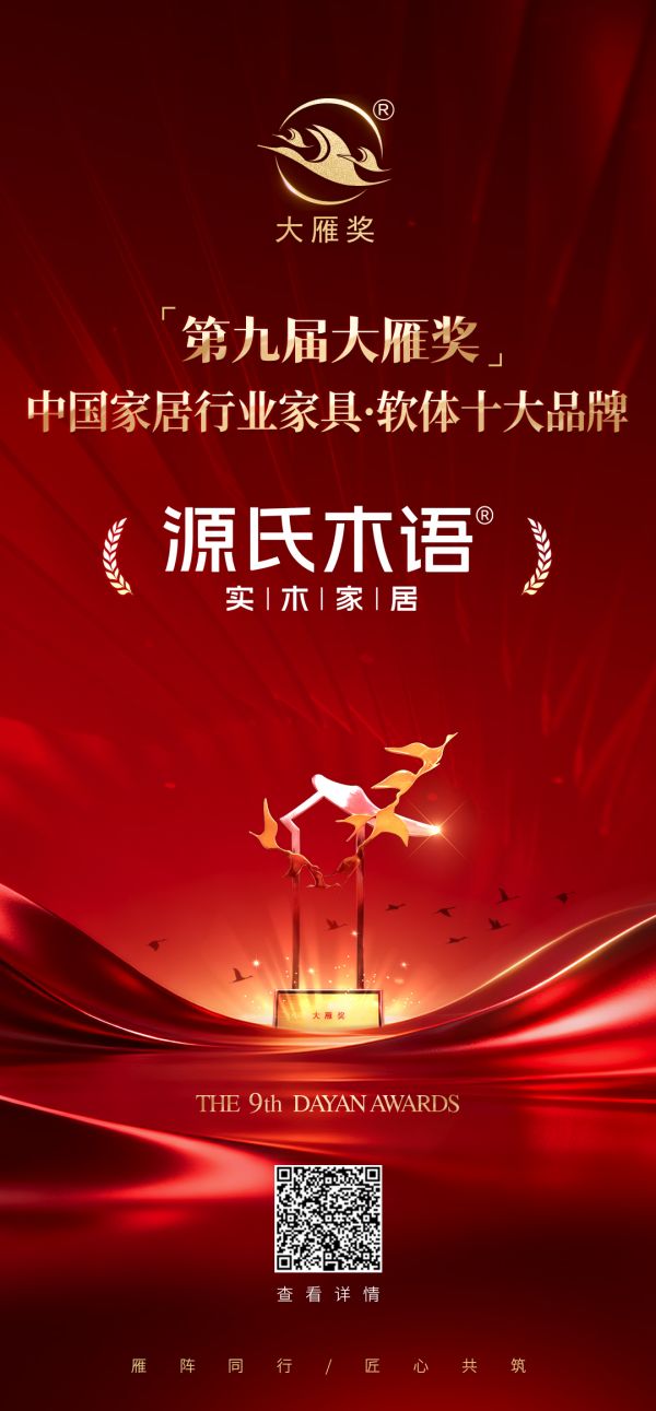 喜报!源氏木语荣膺「第九届大雁奖·中国家居行业家具·软体十大品牌」奖项