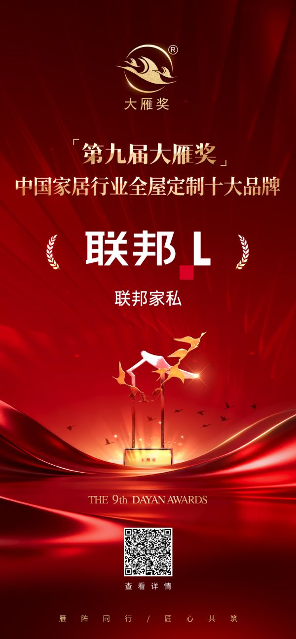 1月30日,「第九届大雁奖」获奖名单于云端发布会正式揭晓。联邦家私凭借其在全屋定制领域的卓越产品力、领先的品牌影响力与持续的市场引领表现,荣获“第九届大雁奖·中国家居行业全屋定制十大品牌”这一细分领域的权威殊荣。