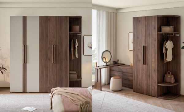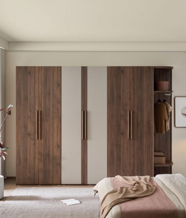 胡桃木纹组合衣柜,尺寸加高,轻松满足四季衣物收纳需求。二、四、五门衣柜及边柜多规格可选,自由组合适应不同卧室布局。四门衣柜以浅灰色巧妙搭配,为中式风格增添一抹清雅韵味。衣柜内部配备皮质衣通及收纳篮,清晰划分悬挂区与折叠区,衣物取放一目了然。还可搭配圆弧边柜使用,既能收纳常用包包等物品,又可作为次净衣区,实用性拉满。