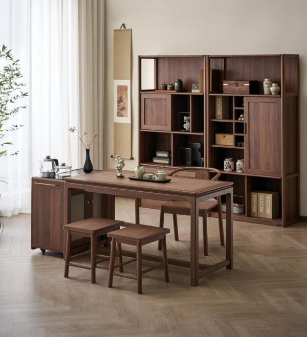 茶桌采用极简造型,胡桃木色自带中式韵味,底部横梁加固整体,还可以作为舒适放脚处。台面特设凹槽,边缘搭配中式云纹式立水造型,婉约优雅。茶柜采用大小开放格错落分布的设计,既能规整收纳各式茶具,也可存放坚果、糖果等年节好物,自成一方风雅小景。