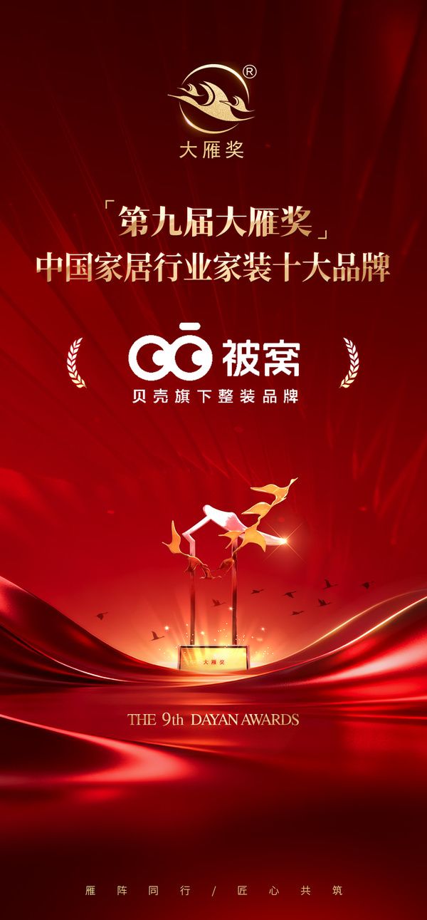 喜报!被窝整装荣膺 「第九届大雁奖·中国家居行业家装十大品牌」奖项