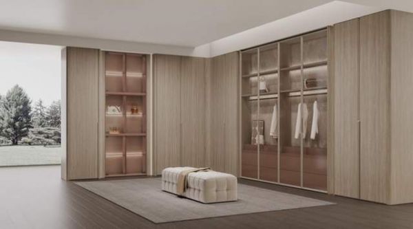 衣帽间衣柜配备折叠金属框门,内嵌竹丝影玻璃,营造光影交织的朦胧美感,开合之间通透灵动。衣物、配饰、包包一目了然,拿放便捷兼具防尘功能,轻松满足全家人的收纳需求。