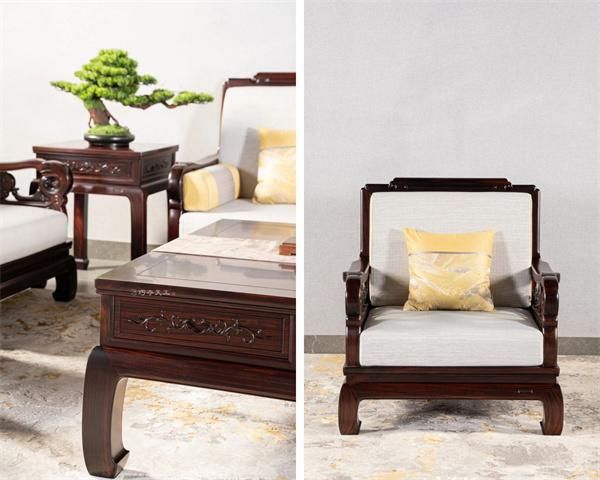 扶手外侧精雕牡丹卷草纹,线条婉转流畅,寓意富贵延绵不绝;外翻龙珠腿线条灵动流畅,为整体增添了几分雅致活力,让古典韵味在现代空间中自然流淌。