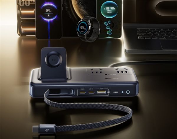 当工位被笔记本、手机、平板、手表团团围住时,一个强大的桌面中枢必不可少。倍思七合一超薄充电站,凭借仅26mm的超薄机身,却能同时为7台设备供电。2个AC插口与多个快充口组合,配合隐藏式伸缩Type-C线及华为手表无线充区,真正实现“一线一充,全设备满电”。100W氮化镓功率搭配全协议兼容,无论是华为的66W超级快充还是苹果的快充需求,都能轻松满足。它不仅是充电器,更是工位整洁美学的践行者。