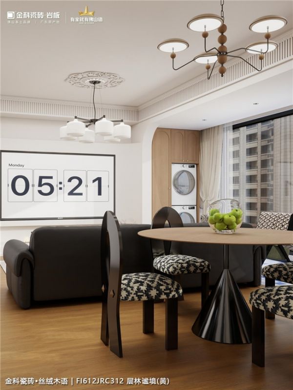 午后阳光透过白纱帘,在柔光砖面上映出柔和光晕,整个家充满了宁静、安稳的电影氛围,让人可以完全放松下来。