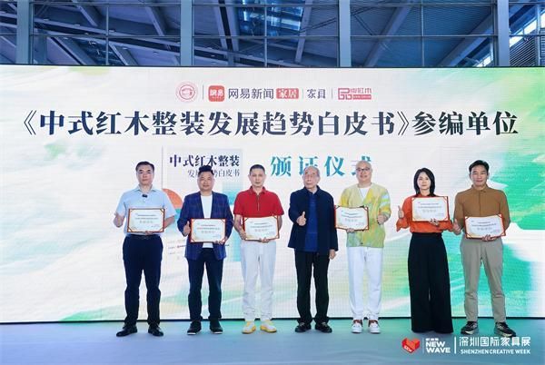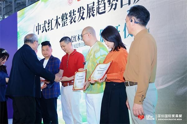 论坛现场还举行了《中式红木整装趋势白皮书》参编单位颁奖仪式,中国红木家具技术专家曹新民为参编单位颁发证书。作为白皮书参编单位红古轩的创始人,吴赤宇一同参与此次颁证仪式。