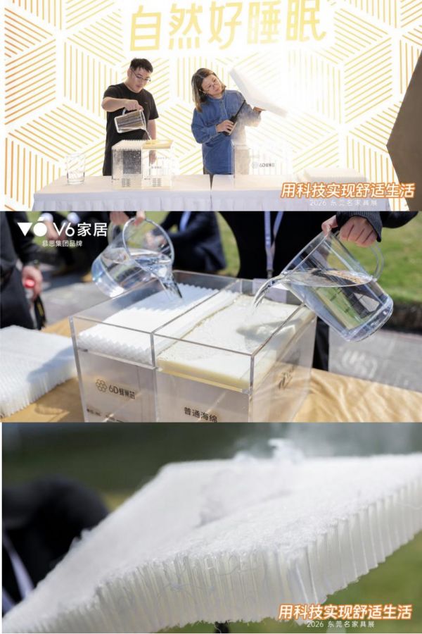聚光东莞,潮启家居新章。3 月15日,以“聚光”为主题的第55届国际名家具展览会在东莞盛大启幕。作为开春家居行业首场重磅盛会,本届展会汇聚超1000家优质展商同台竞技,集中展现家居产业前沿发展趋势与核心创新成果。慕思集团品牌V6家居携6D蜂巢芯、星空自感弹簧两大核心系列寝具新品及多款创新家居产品惊艳亮相,以兼具颜值与硬核科技的产品矩阵,为参展客商、设计师及消费者带来沉浸式舒适家居体验,成为展会焦点品牌之一。