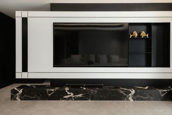 步入大客厅,其电视背景墙,是“时光”概念的又一次延伸。摒弃了传统的落地式布局,采用悬浮式结构,通过穿插手法的叠加,让墙面呈现出丰富的层次感与灵动的视觉节奏。