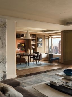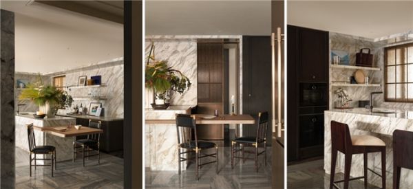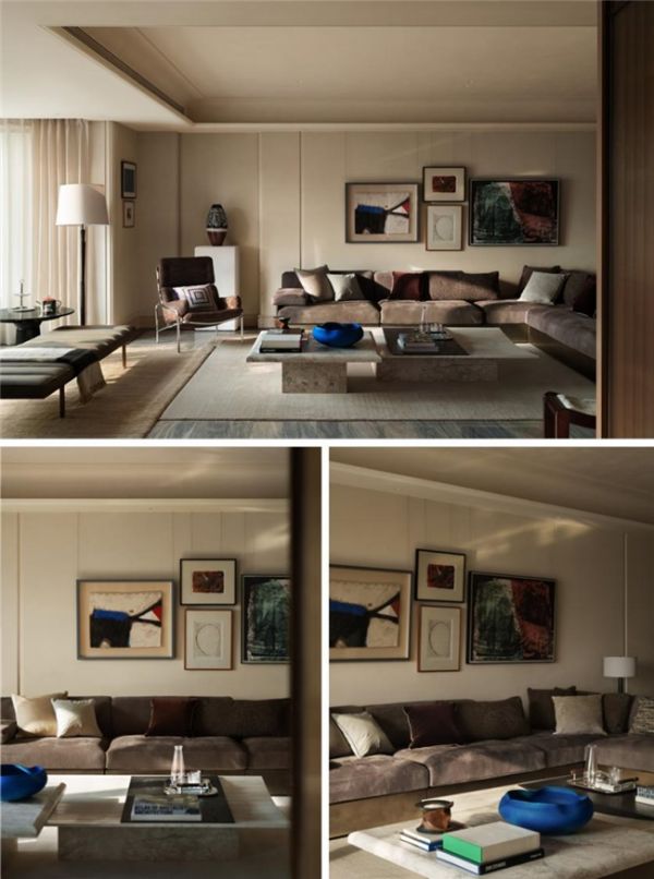 空间中心,超尺度转角沙发以柔软绒面皮革包裹出一隅沉浸式的休憩场域,成为功能与美感的双重载体。两张茶几在视觉上形成巧妙对位,一张线条柔和、带有微弧,另一张体量敦实、形态内敛。与之对话的沙发椅,则以流畅的线条与现代感形态介入空间,其雕塑般的造型与精微的材质触感,进一步延展了空间的感官层次。