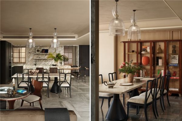 两盏玻璃吊灯悬于餐桌上方,延续着经典设计的简洁线条。桌面选用奢石材质,其自然纹理被纳入法式线条的构图逻辑之中,在低饱和度空间背景下,呈现出沉稳的视觉质感。