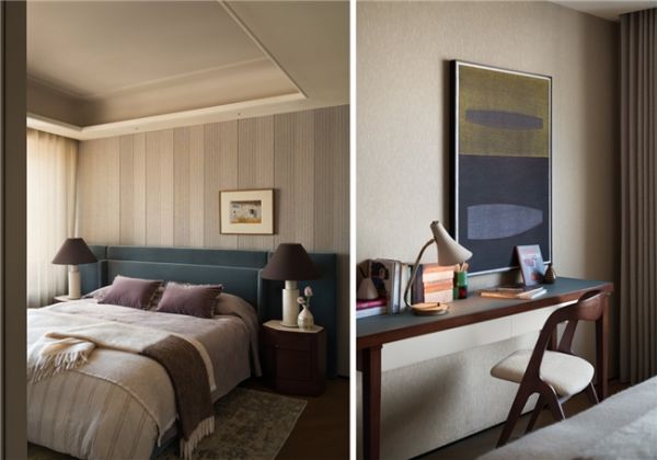 次卧墙面通过大面积温润的织物硬包与木饰面结合,营造出温润而秩序的空间底色。床背材质选择上强调木质的细腻肌理,在克制的色阶中过渡出时间感与价值感。整体空间保持松弛,自然地承载日常生活的从容与安稳。