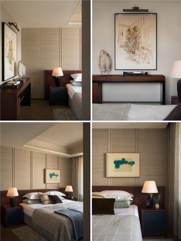 主卧延续整体设计语言,空间氛围转向沉静与内省,塑造优雅而深刻的生活范式。艺术版画赋予空间戏剧张力,暖灰调皮质床靠、珍珠鱼皮床头柜、来自丹麦的羊绒织物与手工锤打的黄铜灯具并置,让经典被解构、转译,自然地融入当下的感官体验。
