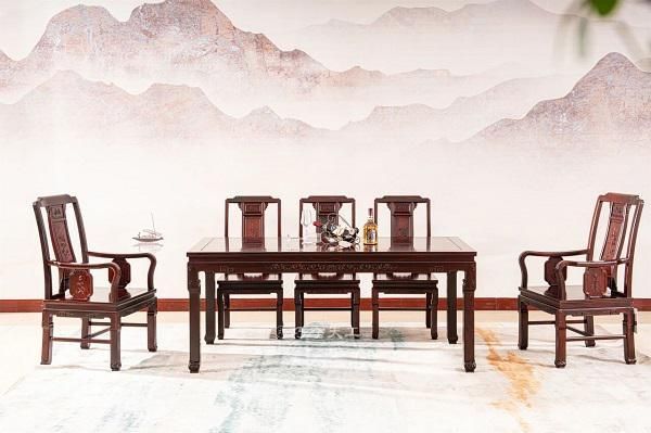 餐椅的设计更是别具匠心。后背呈阶梯状上升,线条清新秀雅。搭脑处的回字纹,与腿部的卷草纹遥相呼应,象征着福庆连绵,生生不息。当一家人围坐于此,碗筷碰撞间,是生活的烟火气;抬眼所及处,是永不凋零的春天。