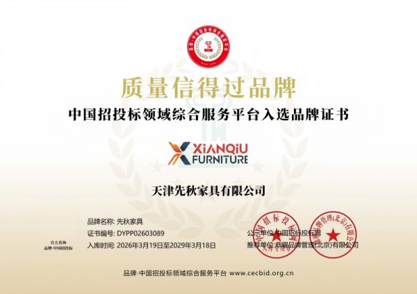 近日,天津先秋家具有限公司再传喜讯,其凭借出色的产品质量和良好的市场口碑,成功荣获由中国招投标领域综合服务平台颁发的“质量信得过品牌”入选品牌证书,证书编号为DYPP02603089。这一殊荣的获得,不仅是对先秋家具产品质量的权威认可,更是对其品牌信誉的高度肯定。