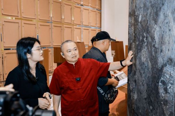 展馆入口处,一块石境系列“墨云流石”体块装置触感冰凉粗粝,引得不少参观者伸手触摸。右侧迷你吧以“敦煌拾色”与“深林胡桃”搭配,复古质感中透出时间的厚度。