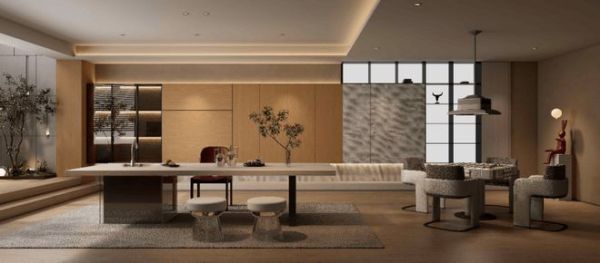 整个展馆被设计为四幕剧场。“浮光剧场”是序章,材质本身的语言在入口处便已铺陈;“繁花剧场”里,五境花色在圆形展台上如花绽放——盛境的同步对纹让木纹触感如真实木材般温润,雅境在克制中传递对自然与时间的敬意,石境记录着地质生命的记忆,艺境将牡丹纹与金玉元素融合,云境的素色澄明则让空间回归纯净的呼吸感;“材艺剧场”中,侘寂风、意式风、中古风、奶油风、宋式美学五个微型场景依次展开,新港用门墙柜地一体化同色系统,让五境在不同风格中自由流动;“和鸣剧场”洽谈区,一面荣誉墙记录着新港33年的技术积累。