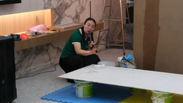 理论模块聚焦双面刮胶工艺标准、震动压实时机、伸缩缝预留规范等核心环节,精细化讲授岩板铺贴技术要点及对施工质量的关键影响。