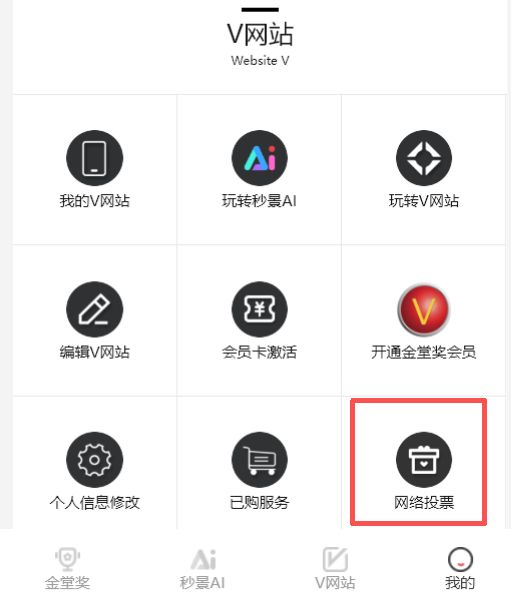 3、登录“金堂奖V站”小程序,在【我的】-【主页】,找到【网络投票】,点击跳转进入投票页面,进行投票;
