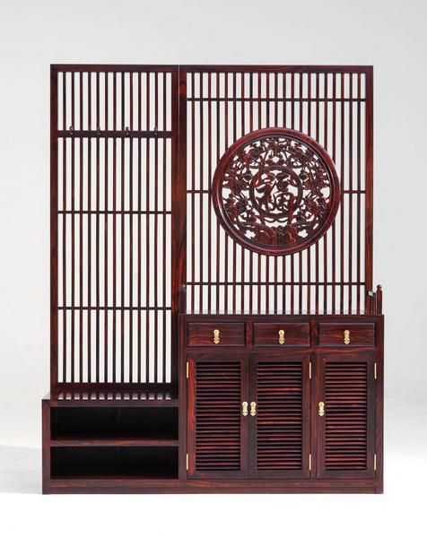 古森红木产品《福禄玄关柜》,雕刻纹样寓意福禄绵长、福运圆满