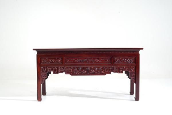 古森红木产品《福纳财运条桌》,以层层叠叠的雕纹铺展万千福意
