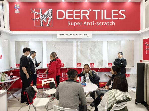 在这一全球核心舞台上,大角鹿以高辨识度的“大角鹿红”强势亮相,多系列高品质超耐磨瓷砖矩阵式陈列,迅速吸引了国际买家的目光。产品直观展现出卓越的超耐磨性能,直击传统瓷砖易刮花、不耐磨等使用痛点,成为展馆内的关注焦点。