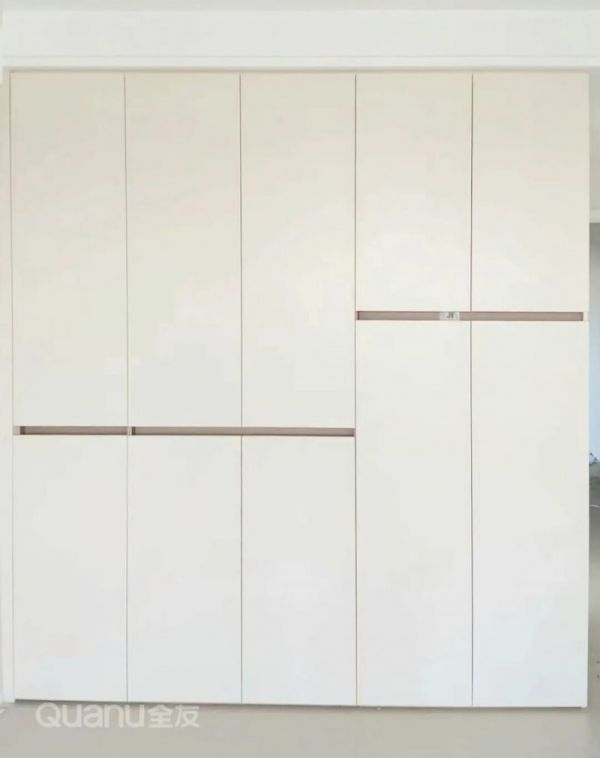 在柜门内侧安装反弹器五金件,按压一下门板就能自动弹开。关上之后柜门表面完全平整,没有任何多余的零件,整体感最强。不过反弹器属于易损件,选择时要多留意质量。各种柜型都适用,算是比较百搭的方案。