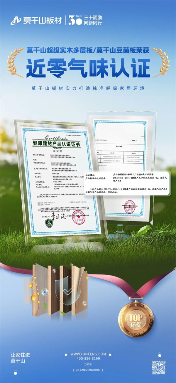 在环保性能方面,莫干山板材表现突出,核心产品均达到国家最高环保标准ENF级,甲醛释放量远低于国标限值,部分产品甚至实现 “未检出” 水平。2025年,莫干山超级实木多层板、豆茵板成功荣获 “近零气味” 健康建材产品认证证书,彰显了品牌攻克室内异味难题的显著成果,为消费者提供了更纯净的家居环境选择。