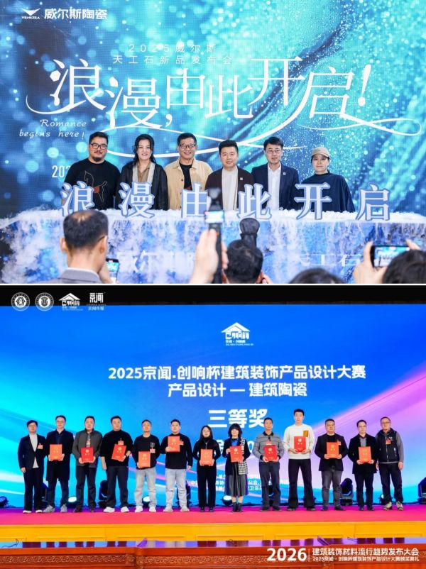 自威尔斯陶瓷玉质石上市发布后引起行业关注和深受市场好评。2025年12月在广州设计周上,威尔斯陶瓷以 “浪漫由此开启” 为主题正式发布天工石系列,迅速成为行业与设计师关注焦点。其中天工石布鲁斯凭借纹理层次丰富、肌理自然舒展、工艺创新突出,荣获京闻·创响杯设计大赛三等奖。该奖项由行业权威机构与资深设计师、建材专家组成评审团,经多维度严苛评选产生,是对产品美学价值与工艺水准的权威认可。天工石突破传统瓷砖纹理浮于表面的通病,实现纹理深植砖体、立体饱满、质感高级,以硬核实力将 “花纹更立体” 落到实处。