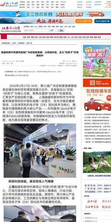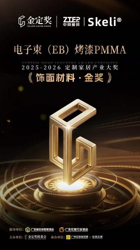 权威媒体认证,行业大奖加持:参加第15届广州定制家居展暨轻高定展后,更是新华网、中国日报、大江网等主流媒体集中报道的唯一EB板材品牌,硬核实力获官方盖章认可。旗下产品中同爱邦-Skeli®电子束(EB)烤漆PMMA更是拿下2025-2026定制家居产业金定奖“饰面材料金奖”,获得高端定制圈高度认可。