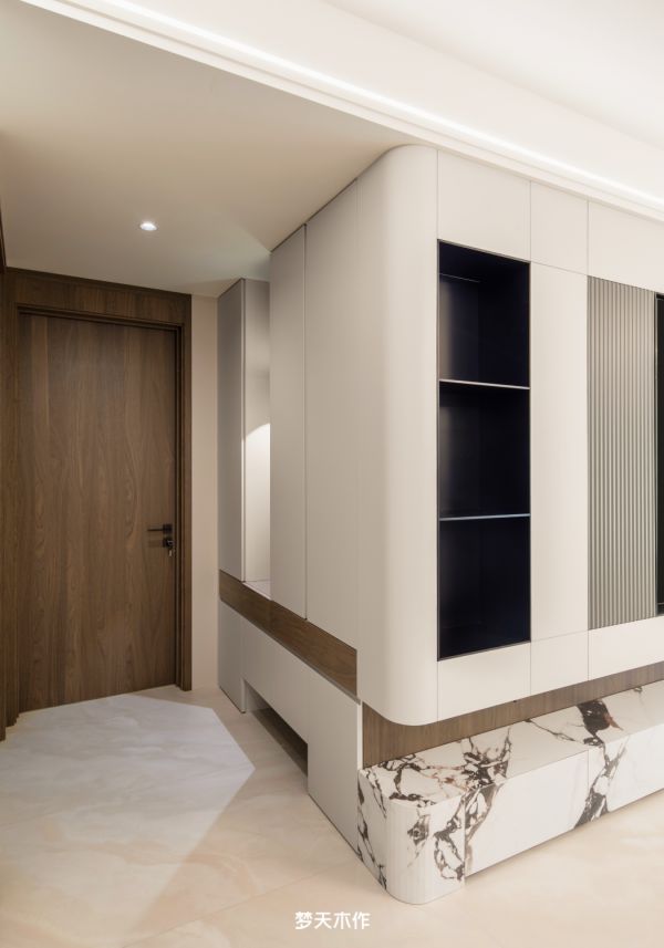 设计巧思延续至玄关,入户柜与电视柜一体成型,延续了整体的连贯美感。转角处以柔和的圆弧收边,不仅视觉温润更确保了安全;南山灰色块的穿插与底部留空设计,既构成了块面穿插的造型美,也暗藏了收纳拖鞋的实用功能。