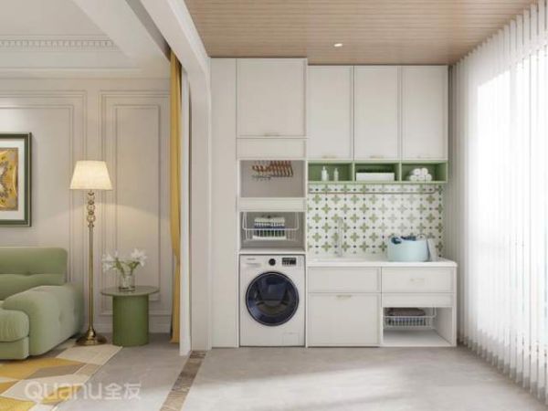 内嵌洗烘套装,上面吊柜放洗衣液、柔顺剂,下面地柜藏脏衣篮。洗手台用来刷鞋、洗袜子,洗完就能直接晾晒。