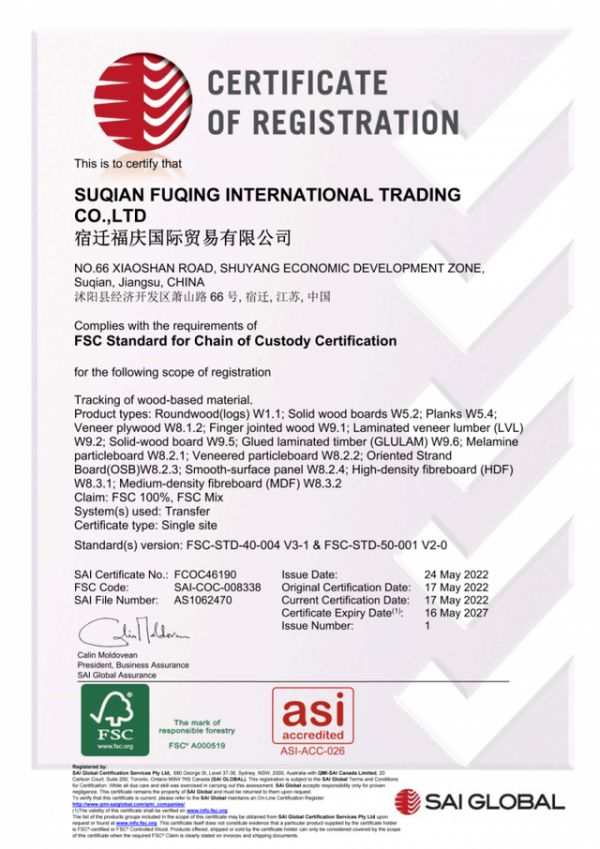 目前福庆LVL已形成多规格、多等级产品矩阵,可按项目需求调整参数与尺寸,为客户提供定制化服务;依托中国、越南两大生产基地的标准化运营,批量订单的产品一致性得到保障,交付周期可控;同时福庆LVL产品持有FSC、PEFC等权威认证,达到 E0 级环保标准,满足全球主流市场准入要求。