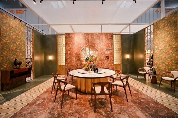 围绕一日之中的生活节律,展馆设置了晨启、雅聚、茶叙、礼宴等多个典型场景:从清晨卫浴与庭院的舒展自然,到午时客餐厅的温暖团聚;从申时茶室的静心松弛,到戌时会客包房的礼序雅叙,华韵高端岩板通过不同空间氛围的切换,展现了其在改善型人居场景中的适配能力。