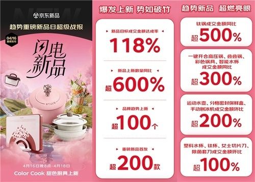 除富光黑金纯钛保温杯外,京东厨具上新同样表现亮眼。4月16日,京东“趋势重磅新品日”开启,集结超200款新品、联动超100家品牌,共同推动厨房场景焕新升级。活动期间,趋势品类增长显著,钛锅成交额同比增长超5倍,高压锅、叠叠锅、彩色锅具及智能水杯同比增长超3倍,运动水壶、保鲜盒、刨冰机环比增长超2倍,钛杯、塑料水杯、切片刀、除菌套刀等环比增长均超100%,全品类展现出强劲增长势能。